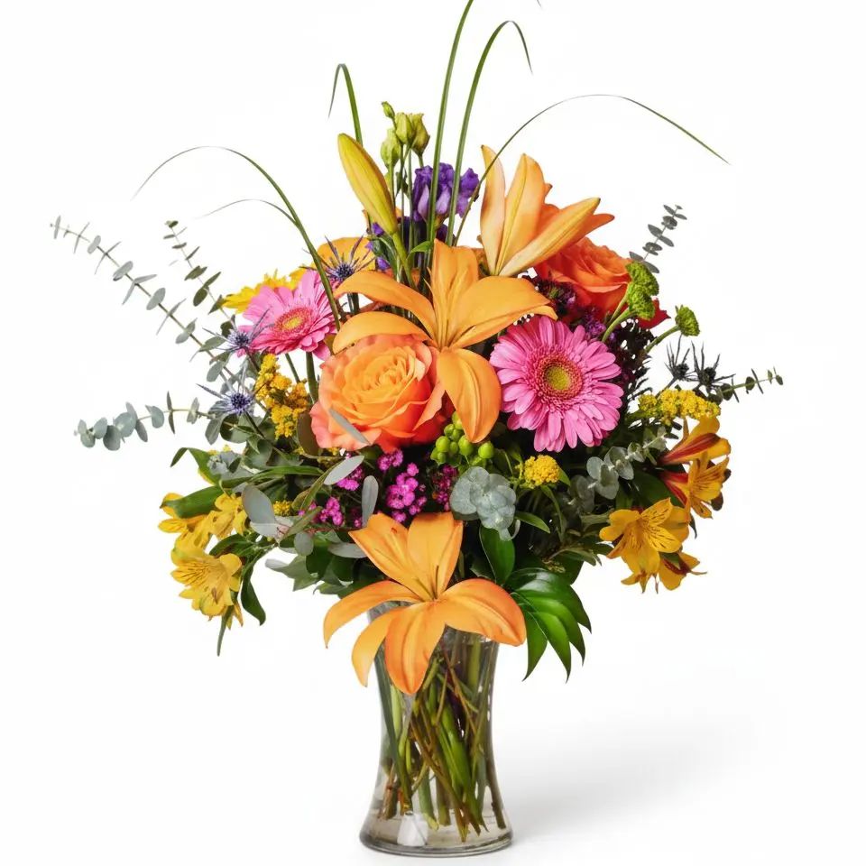 Step into the radiant beauty of a Golden Hour Garden with this vibrant arrangement! Sun-kissed orange lilies and roses, cheerful pink gerberas, and bright yellow blooms dance among lush greens and a touch of enchanting purple. This exquisite bouquet brings warmth and joy, transforming any space into a dazzling sanctuary of natural splendor.