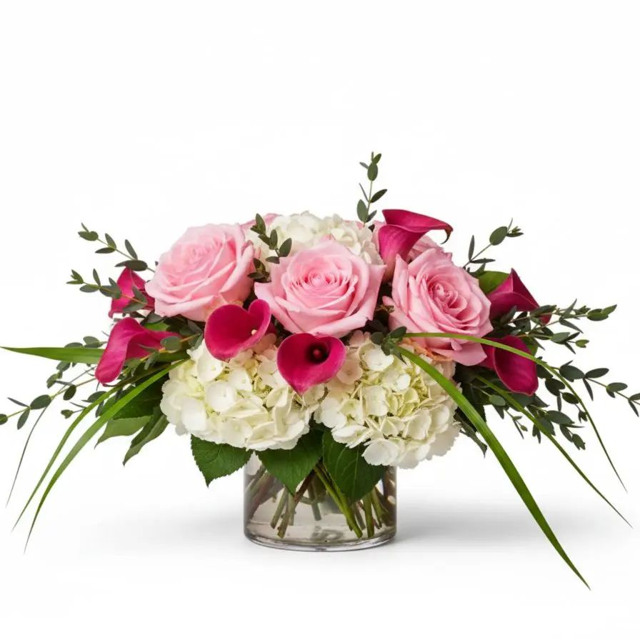 Experience graceful beauty with Pink Petal Serenity, where lush white hydrangeas create a serene foundation. Romantic Pink O’Hara garden roses and vivid hot pink mini calla lilies add vibrant charm and elegance. Accented with flowing lily grass and soft eucalyptus, this arrangement brings peaceful luxury to any setting.